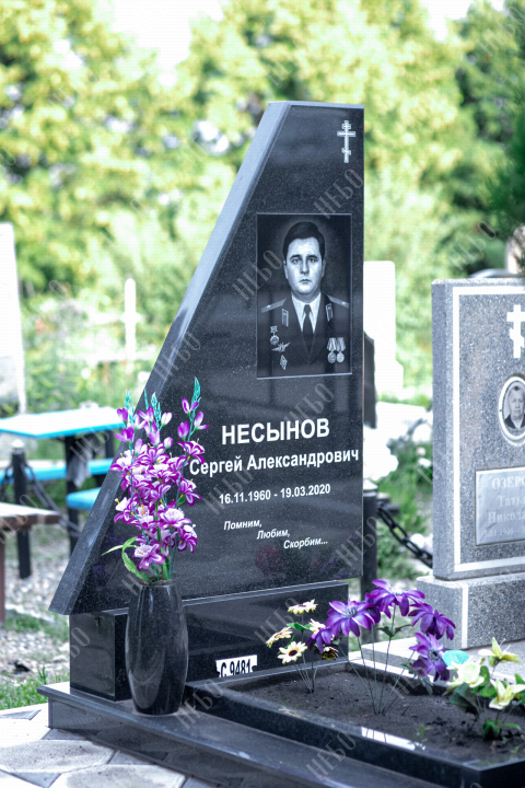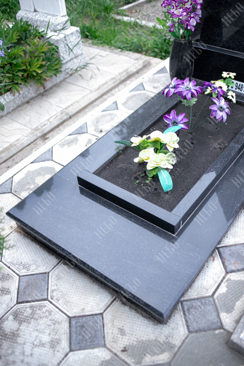 Ассиметричный памятник с крестом, вазой и открытым надгробием. Ритуальное изделие выполнено в строгом лаконичном стиле, классическом черном цвете. Стела памятника ассиметрична и прекрасно сочетается с другими деталями памятника. В гранитной вазе у основания стелы будут гармонично смотреться цветы, дополняя визуальный образ ритуального изделия. Открытое надгробие позволит использовать пространство на его поверхности для высадки цветов. Размеры стелы и надгробия соответствуют заданным нормам при имеющейся нагрузке и исключают деформации изделия.