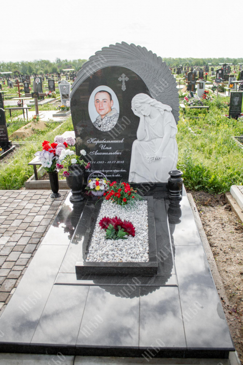 Памятник фрезерный с фигурой ангела и открытым надгробием. Использование фрезеровки в изготовлении ритуальных изделий гарантирует высочайшую точность исполнения запланированного дизайна. С помощью этой технологии в камне высекаются углубления по заданным макетам, придавая памятнику объем, позволяя комбинировать различные элементы и создавать сложные фигуры. На фрезерованном памятнике удачно контрастируют цвета и в солнечную погоду играют тени от объемных деталей. Размеры стелы и надгробия соответствуют заданным нормам при имеющейся нагрузке и исключают деформации изделия со временем.