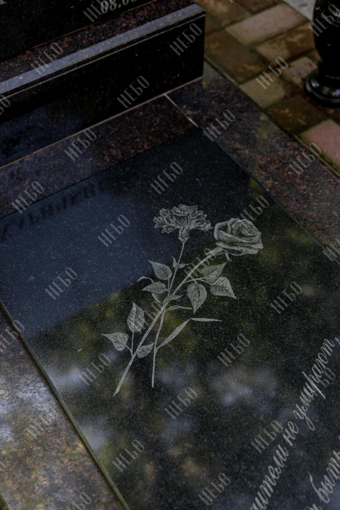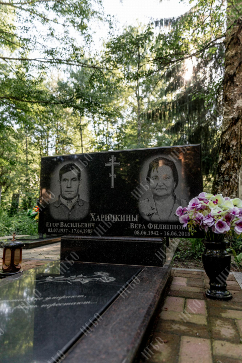 Горизонтальный семейный памятник с вазой , лампадой и закрытым надгробием. Невысокая надгробная стела прямоугольной формы содержит фото, информацию об усопших и изображение креста. Она отлично сочетается с закрытым гранитным надгробием. Такое решение является практичным и значительно упрощает уход за ритуальным изделием. Размеры памятника тщательно проработаны специалистами, что гарантирует конструкции долговечность и надежность.